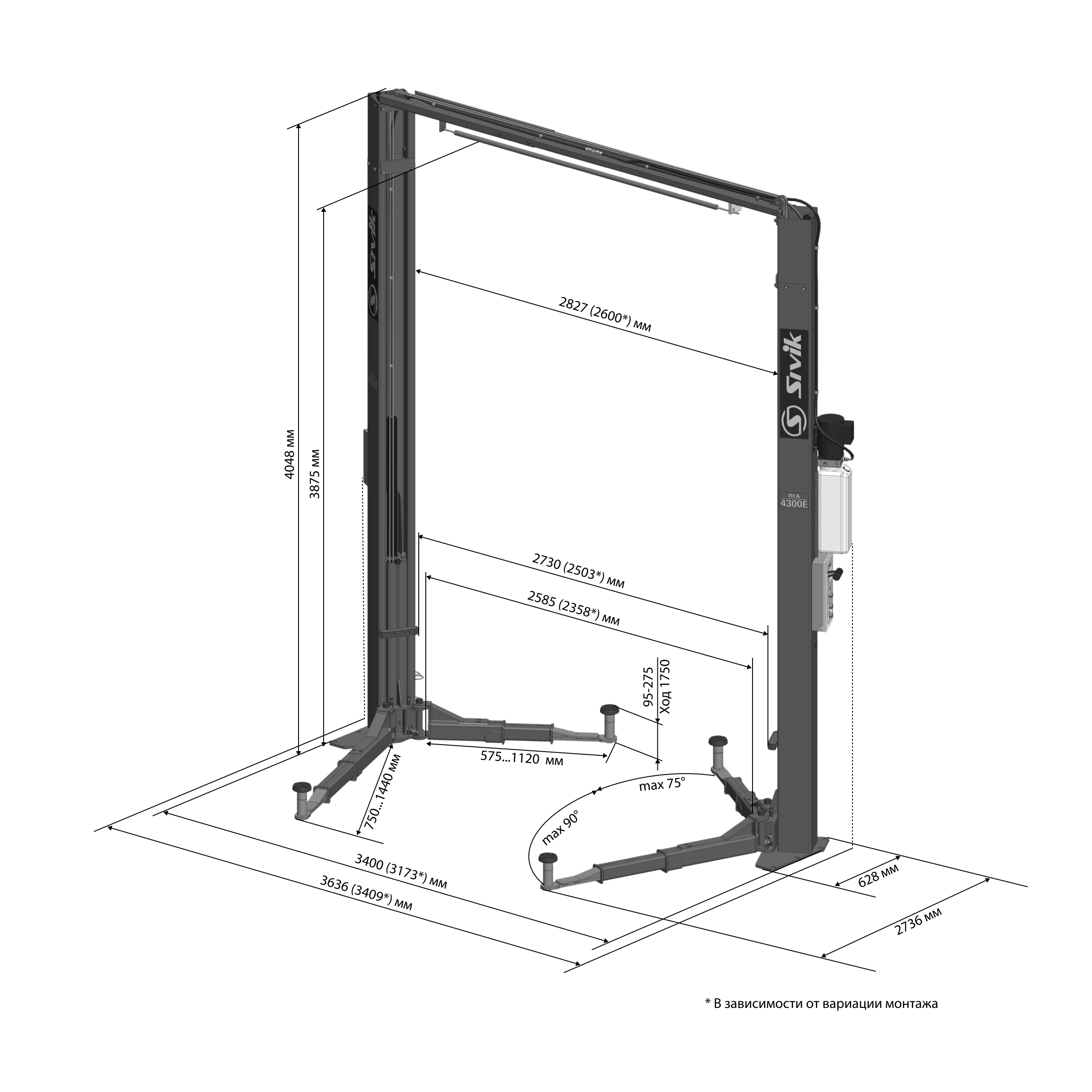 Подъемник можно установить в двух вариациях: с увеличенной шириной проезда 2585 мм и со стандартной шириной проезда 2358 мм